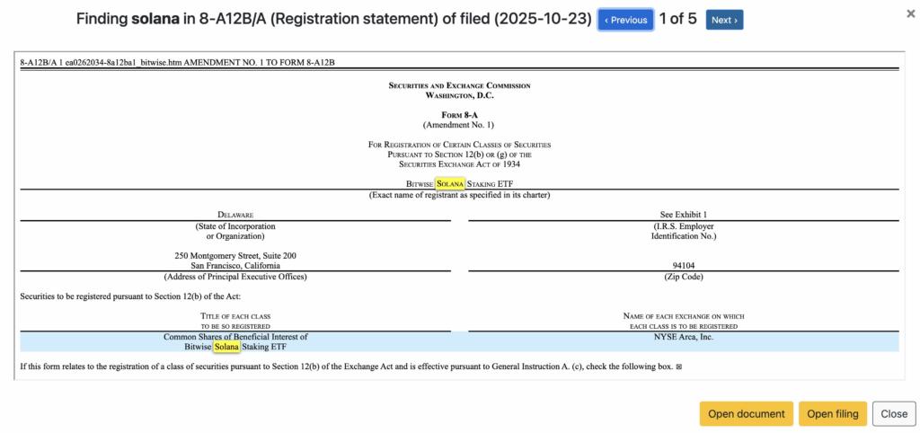Bitwise Solana Staking ETF(BSOL)准备上市,发行人已向美国证券交易委员会(SEC)提交了修订后的 8-A 文件。