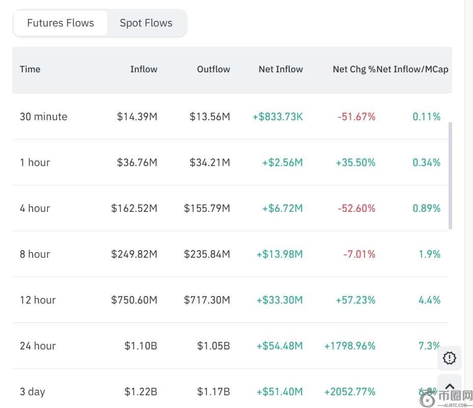 值得注意的是,人类的期货流入量为 11 亿美元,而流出量为 10.5 亿美元。结果,的期货净流量激增 1798%,达到 5448 万美元,反映出更高的资本流入。