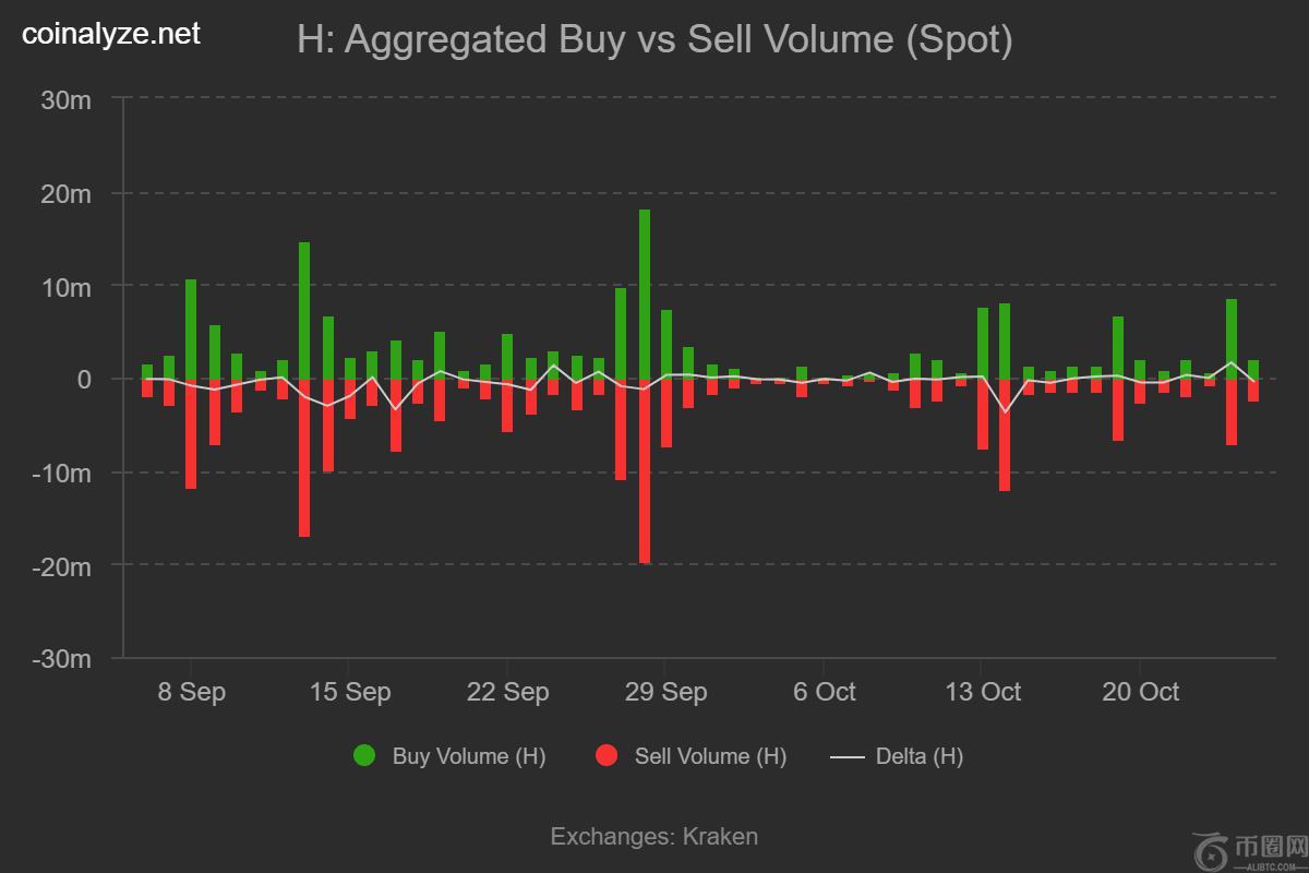 根据Coinalyze,该的卖出量为 241 万,而买入量为 200 万。因此,其 delta 值为 40.1 万,这明显表明现货卖盘有所增加。
