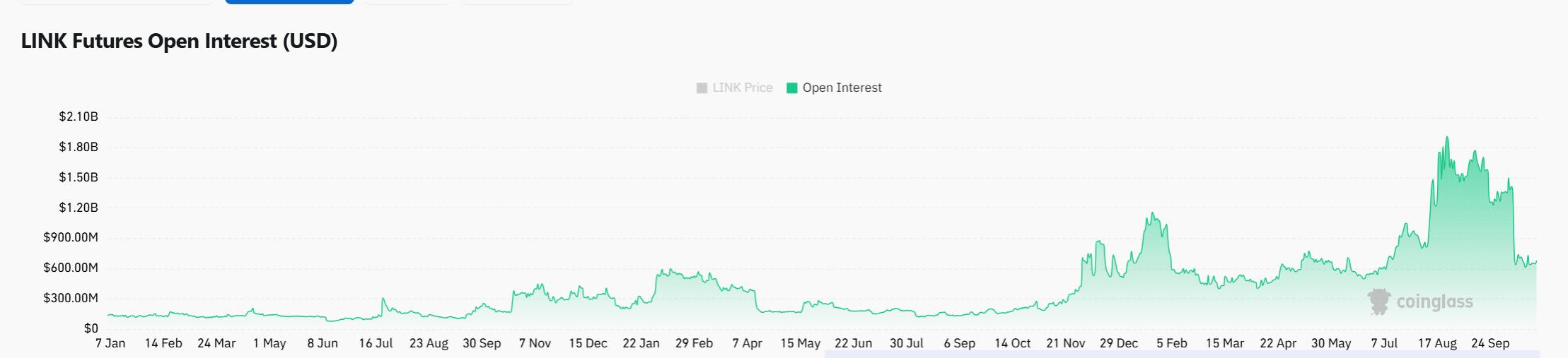截至发稿时,未平仓合约激增 7.72% 至 6.9485 亿美元,表明交易者参与度增加以及 LINK 衍生品市场的资本流入增加。