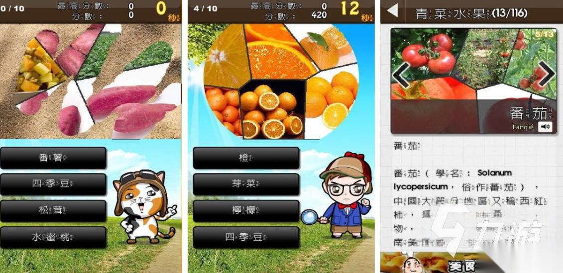 青菜水果猜猜在玩法上和看图猜谜的玩法比较相似,游戏有着不错的益智效果。游戏开始以后,屏幕中会出现不同的青菜以及水果,玩家需要从下面给出的不同答案中,把正确的青菜水果名字给找出来。当大家把正确的名字找出来以后,系统还深入的给玩家们介绍青菜水果中所蕴涵的营养元素都是什么。虽然游戏玩法不适合成年人,可是写实的背景风格以及看图猜谜的方式却非常的适合小朋友。小朋友们在这里既能认识到更多的青菜水果还能了解青菜水果都富有什么营养。