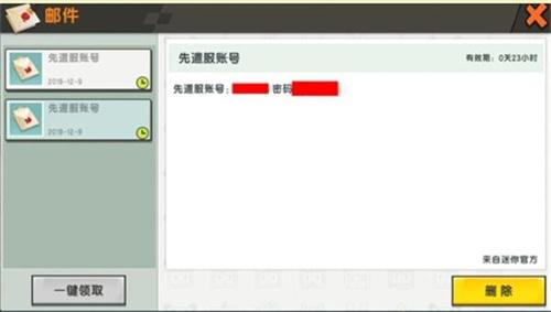 4、发送帐密后,我们登录正式服,就可以在游戏邮箱里查看先遣服的账号和密码。