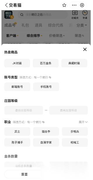 交易猫中的商品是很丰富的,就拿明日之后这款游戏来说,进入平台搜索游戏的名字,立刻就能进入专属专区,各类成品号、卡级号、道具号等各具特色的账号一目了然,大家很方便的就可以浏览查询。而且官服、渠道服等各种客户端服务器都能挑选,平台还支持精准筛选,大家能自行选定有典藏时装、指定战斗等级或稀有武器的账号,每款账号都标注详细的介绍,可以尽情的对比选择,卖家都经过了实人的认证,信用情况直接在主页展示,挑选对比起来更省心。