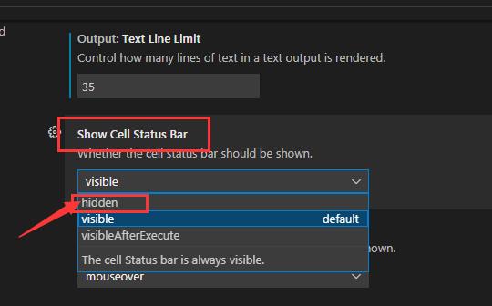 3、然后找到右侧中的"show cell status bar",点击选项栏的下拉按钮,将其选择为"hidden"即可。