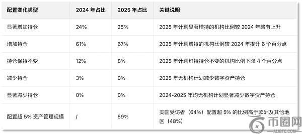 根据安永-Coinbase联合发布的《2025年机构投资者数字资产调查报告》显示,资产管理公司、对冲基金、私人银行、风投基金、家族办公室等在资产配置决策有影响力的机构投资者,都对加密资产产生了浓厚的兴趣。报告指出86%的受访机构投资者已持有数字资产敞口,并计划在2025年后进一步扩大配置。