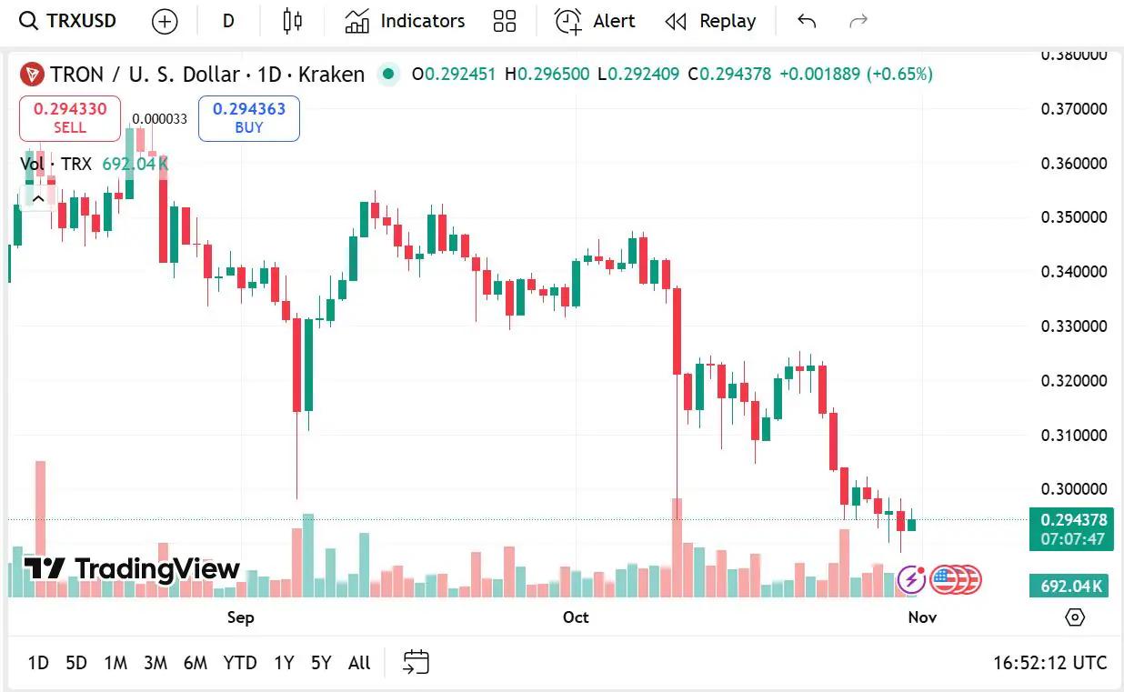TRON 的价格走势平稳,展现出较强的韧性,目前售价为 0.2943 美元,24 小时内上涨 0.89%。其市值达到 279.8 亿美元,日活跃交易量为 8.7025 亿美元,尽管该数据较上年同期下跌了 37.89%。