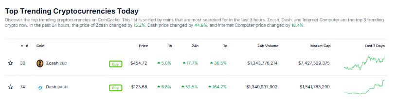 根据 CoinGecko 的数据,Dash 和 Zcash 位列今日热门加密货币榜首,在过去 24 小时内分别上涨了 68% 和 21%,并且本周分别取得了令人瞩目的 201.5% 和 43% 的涨幅。