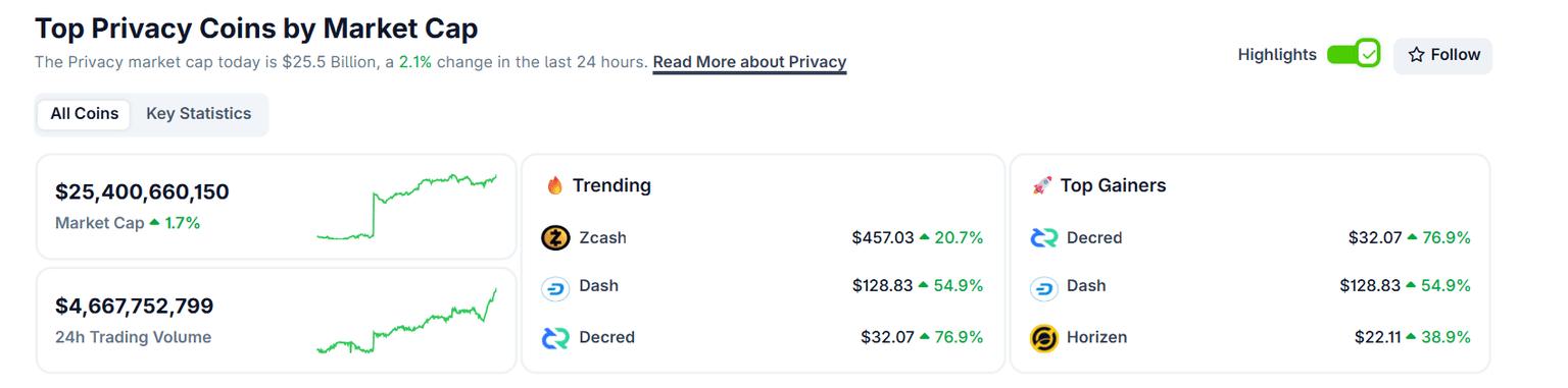 隐私币市值突破 250 亿美元,以最高的月度回报率领跑加密货币领域。