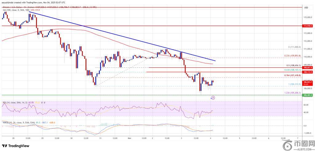 比特币目前交易价格低于 108,000 美元。100 小时简单移动平均线比特币测试了从 106,310 美元低点到 111,000 美元高点上涨行情的 1.236 斐波那契扩展位。