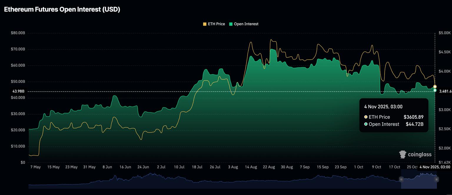 零售市场对以太坊的需求也大幅下降,期货未平仓合约 (OI) 从 10 月份的峰值约 630 亿美元降至 447.2 亿美元。