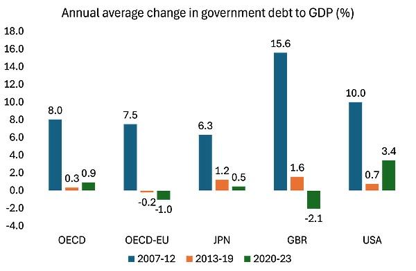21世纪公共部门债务大幅上升的原因在于:2008-2009年全球金融危机期间对金融和私营部门的救助、2012年之前的欧元区债务危机,以及为帮助民众度过2020年疫情冲击而提供的财政支持。在这些时期,政府债务比率飙升。而在两者之间的时期,紧缩政策(特别是削减福利和基础设施投资)以及经济增长的一定程度的复苏,使得债务比率基本保持稳定。与此同时,个人所得税(特别是针对高收入群体)和企业所得税的削减,使得政府税收收入占GDP的比重保持在35%左右的水平,而政府支出占GDP的比重则有所上升(国际货币基金组织数据)。