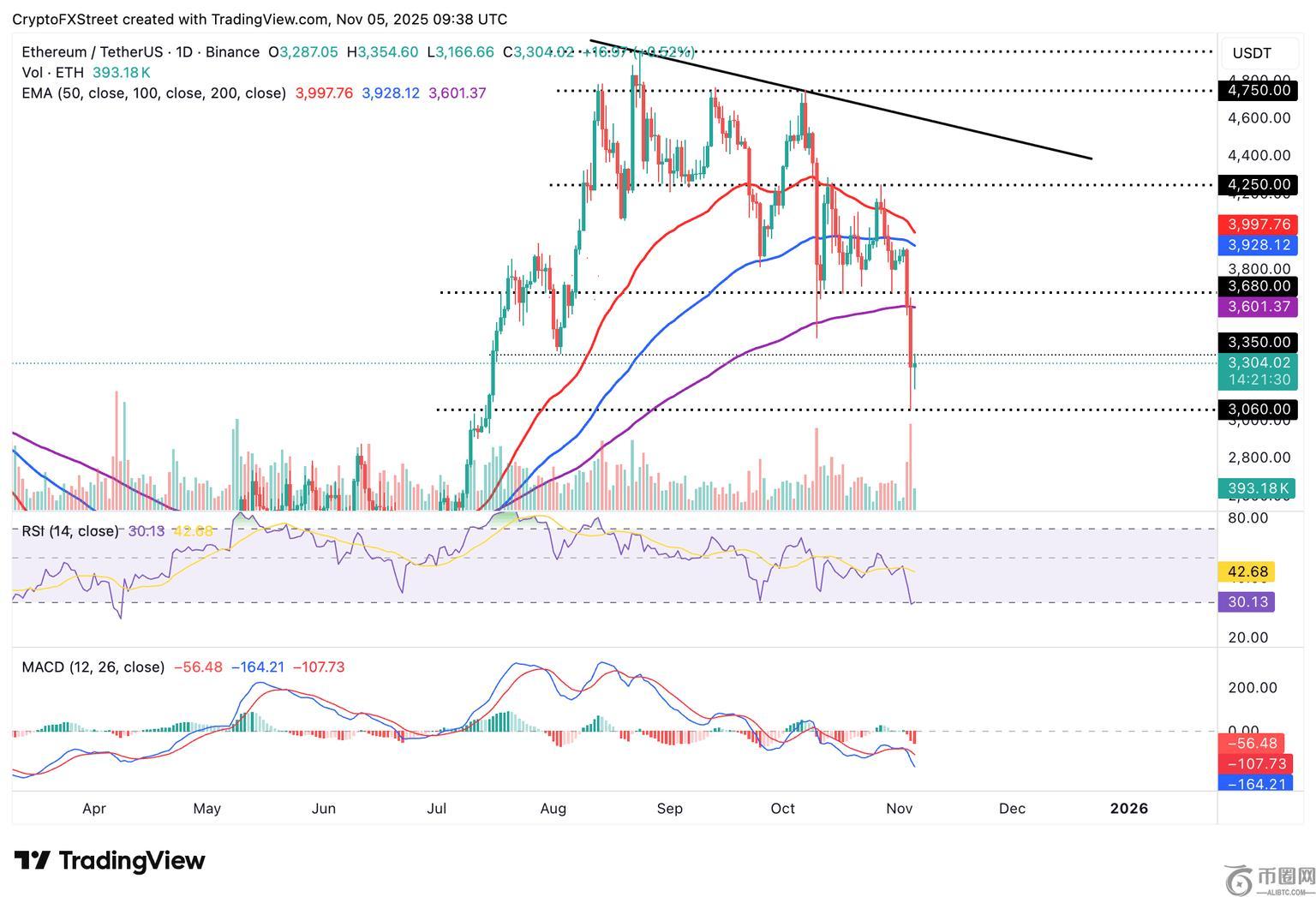 截至周三发稿时,以太坊交易价格略高于 3300 美元,此前空头在周一加深了回调,测试了 3060 美元的支撑位。日线图上的相对强弱指数 (RSI) 为 29,表明市场处于超卖状态,潜在的企稳之后可能会出现一波反弹,目标位是 200 日指数移动平均线 (EMA) 所在的下一个阻力位 3601 美元。