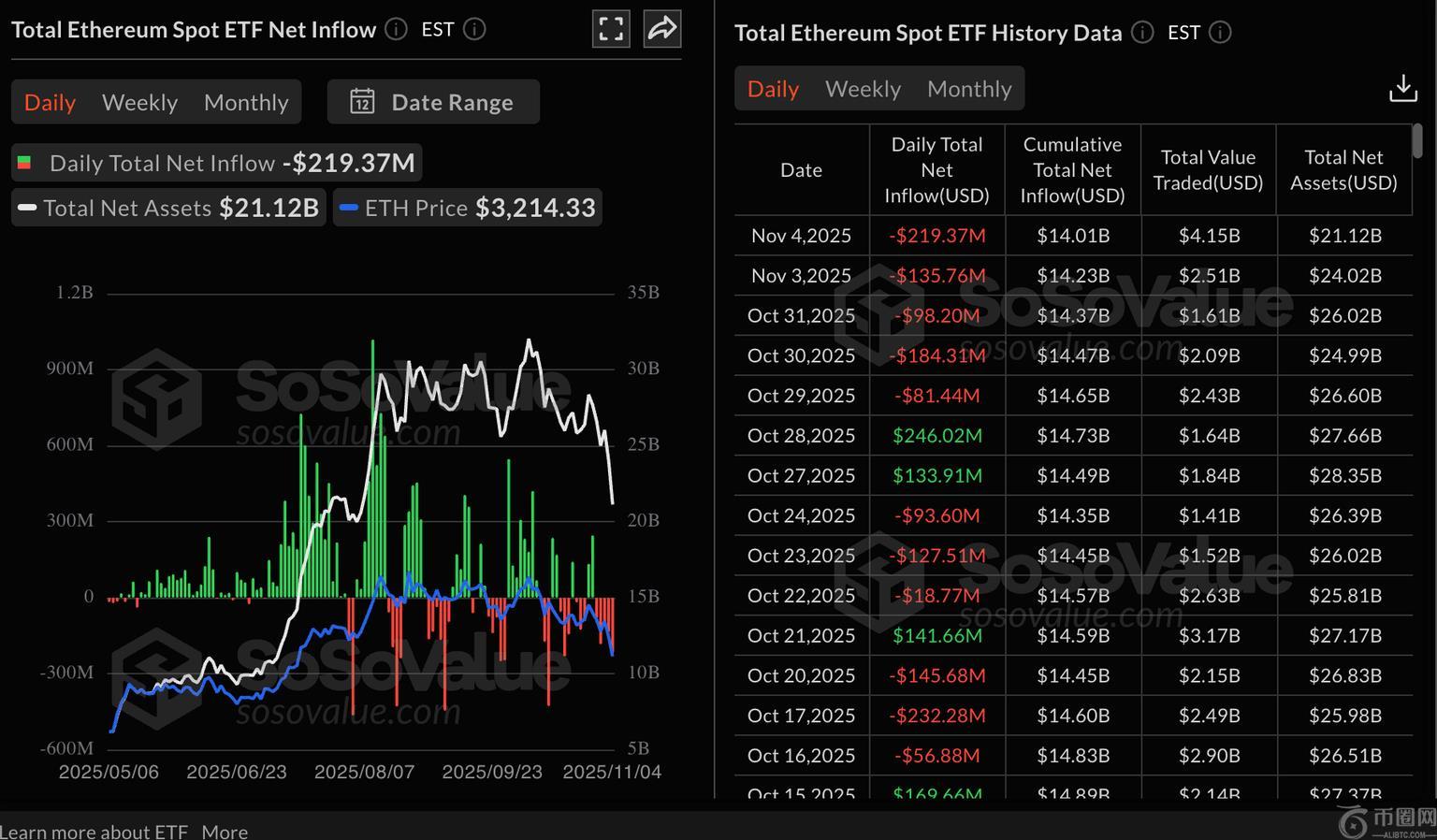 机构投资者对以太坊相关金融产品(例如现货交易所交易基金 (ETF))的兴趣持续低迷,似乎难以逆转。根据 SoSoValue 的数据,周二在美国上市的以太坊 ETF 资金流出约 2.19 亿美元。这标志着连续第五个交易日出现资金流出,累计资金流入量为 140.1 亿美元,净资产为 211.2 亿美元。
