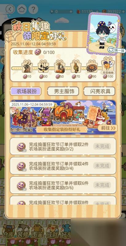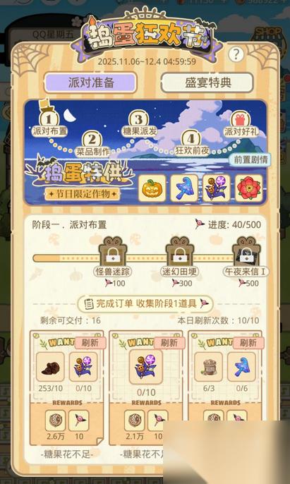 活动分“派对布置→菜品制作→糖果派发→狂欢前夜”4阶段,当前先冲派对布置:完成订单攒“魔杖道具”涨进度(现在我进度才40/500),进度到100/300/500能解锁“怪兽迷踪”“迷幻田埂”这些万圣节装扮,后续阶段要等前置做完才会开~