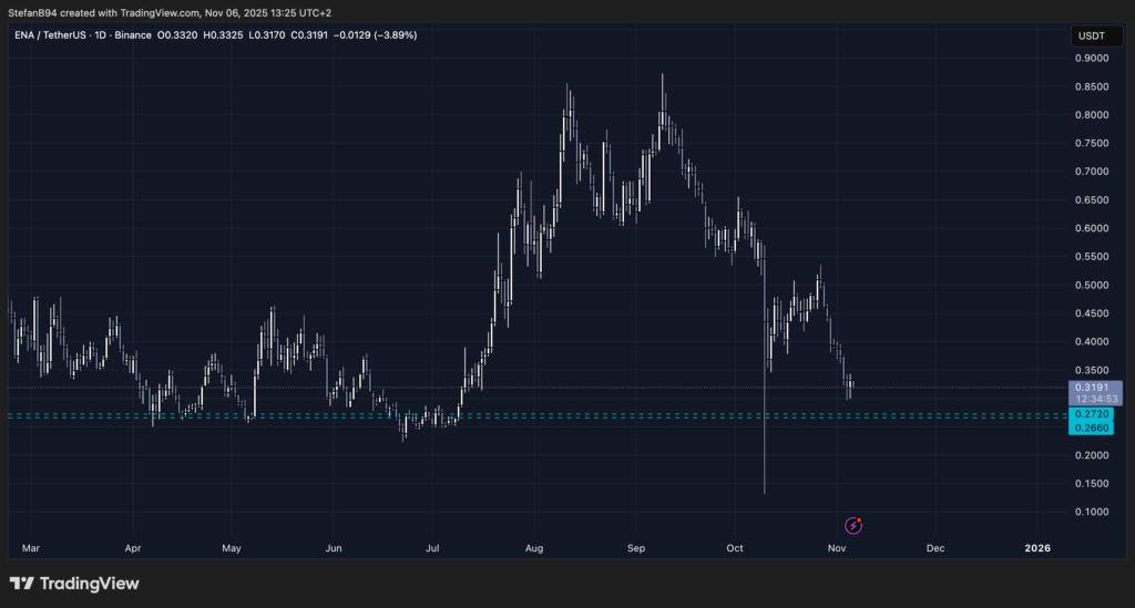 这并非以太坊 (ENA) 加密货币首次跌至此区域,但这一次似乎至关重要。ENA 目前位于 0.27 至 0.26 的重要支撑区间上方,而此前强劲反弹也曾发生在同一区域。