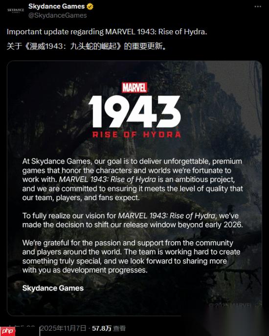 游戏开发商Skydance Games在官方声明中指出,《漫威1943:九头蛇崛起》是一个极具野心的项目,团队始终致力于将其打造成一款符合开发者、玩家以及漫威粉丝们高期待的高品质作品。为了能够完整实现游戏的全部愿景,公司最终决定将发售日期推迟至2026年初之后(beyond early 2026)。
