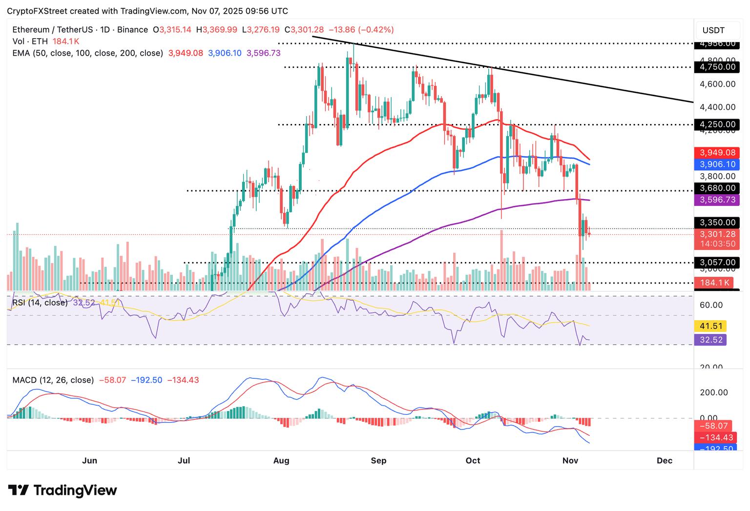 以太坊在从日内高点 3369 美元回调后,目前交易价格略低于 3300 美元。这种智能合约代币的价格低于关键移动平均线,包括 200 日指数移动平均线 (EMA) 3596 美元、100 日 EMA 3905 美元和 50 日 EMA 3949 美元,所有这些都强化了看跌情绪。