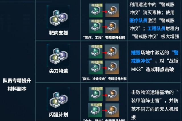 另外玩家还可以去关注深红武装副本,这里就是培养武器的所在之地。主要的获取材料就是武器兑换币,还有模组数据单元以及活性合金锻料。前两者是更换武器,还有刷模主词条的关键,后者就是工程职业在提升专精时的必要材料。想要给队伍配强力的武器,想要养医疗队员,那这个副本必须要刷满。接着就是职业专精材料本产出完全是对应自己的职业,所以千万不要搞混合。靶向支援副本就可以获得影刃职业,还有冲锋突击职业的专精提升材料。