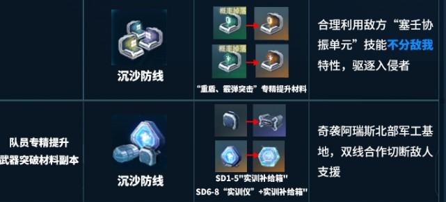 还有两个特殊的副本,一个就是猎金行动,产出物就是充能晶核,还有信用币。相当于打一次副本就可以拿到两个日常副本的核心资源,要是哪一天忘记打也可以选择补回来,效率还是比较高的。阿瑞斯北部军工基地的玩法也并不单调,组队配合去打更加的有意思。另外一个就是实训材料副本,也会分成两个阶段产出的会有所区别,一个可以获得实训补给箱,另外一个就可以获得实训仪。这就是一个关键的道具,在后期养成的时候是不可以缺少的,所以一定要选择优先的刷取满。