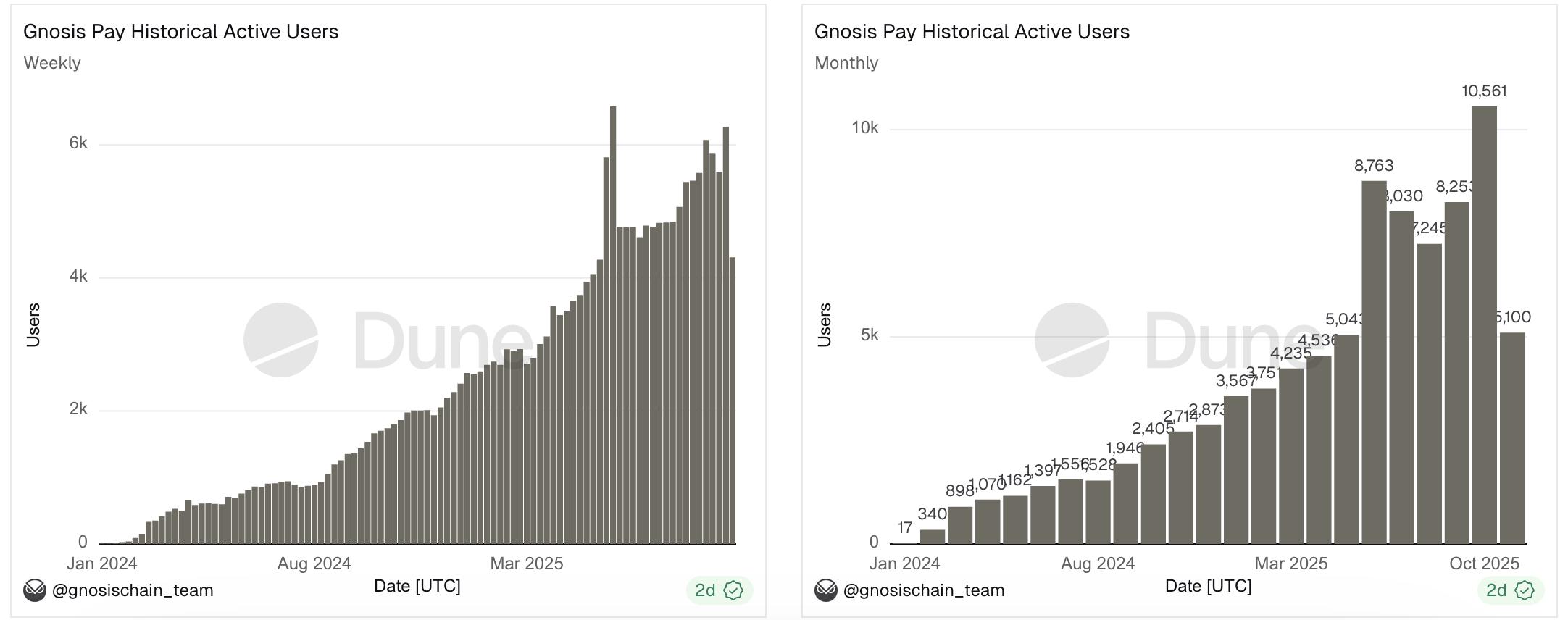 自上线以来,Gnosis Pay数据表现良好, 已处理超过 170 万笔支付,总金额超过 170 万美元,平台支持的资金地址数量超过 21,000 个。Gnosis Pay 的周活跃用户与月活跃用户均保持稳定增长,表明其产品需求持续上升且趋于稳健。