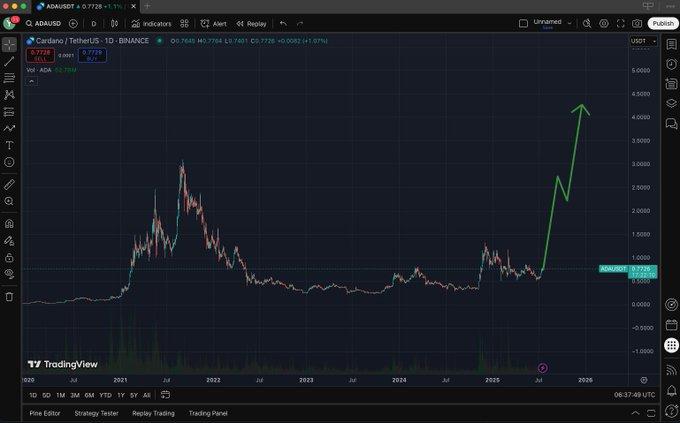 加密货币分析师 Mintern 将看涨预测延长至 0.70 美元以上。共享一张图表预测 Cardano 的价格将从 0.77 美元上涨至 4-5 美元。Mintern 的帖子充满了信心,鼓舞了 Cardano 的支持者,并激发了人们对 ADA 能在 2025 年重回并超越其历史最高点的乐观情绪。