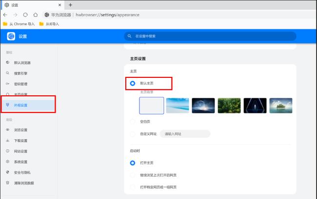 3、在打开的窗口界面中,点击左侧栏中的"外观设置"选项,然后找到右侧中的"主页设置"选项,可以点击"默认设置",并选择一个合适的主页背景。