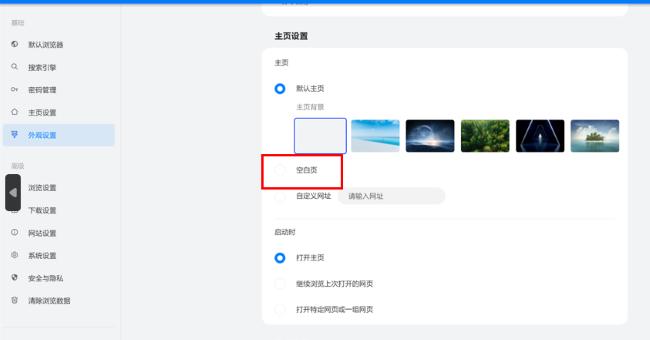 4、也点击"空白页",这样打开浏览器主页就是空白页。