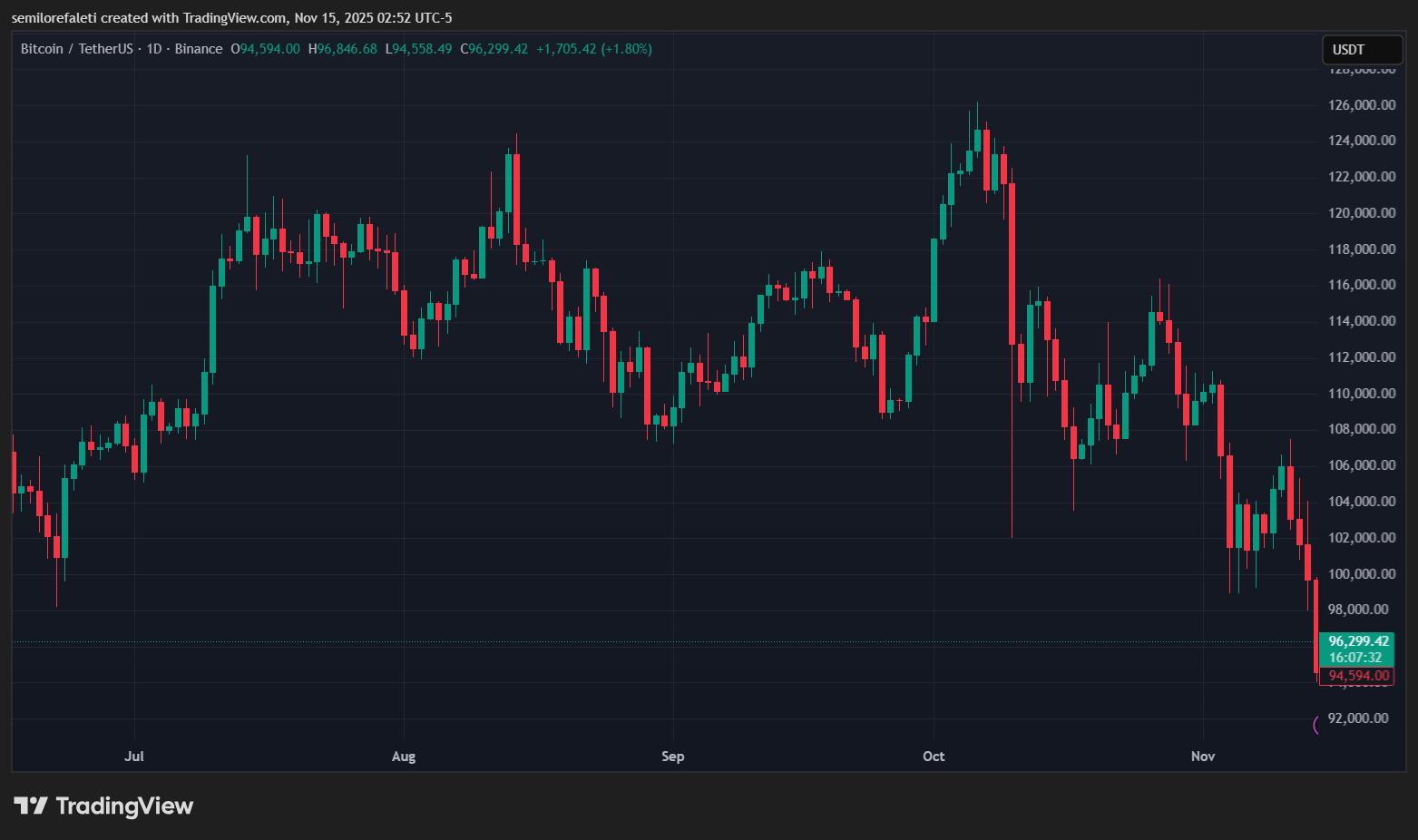 自10月初创下12.6万美元的历史新高以来,比特币进入大幅回调阶段,过去五周市值下跌了24.66%。该加密货币也已跌破10万美元的心理支撑位,导致市场情绪大幅下滑,短期投资者目前蒙受损失。