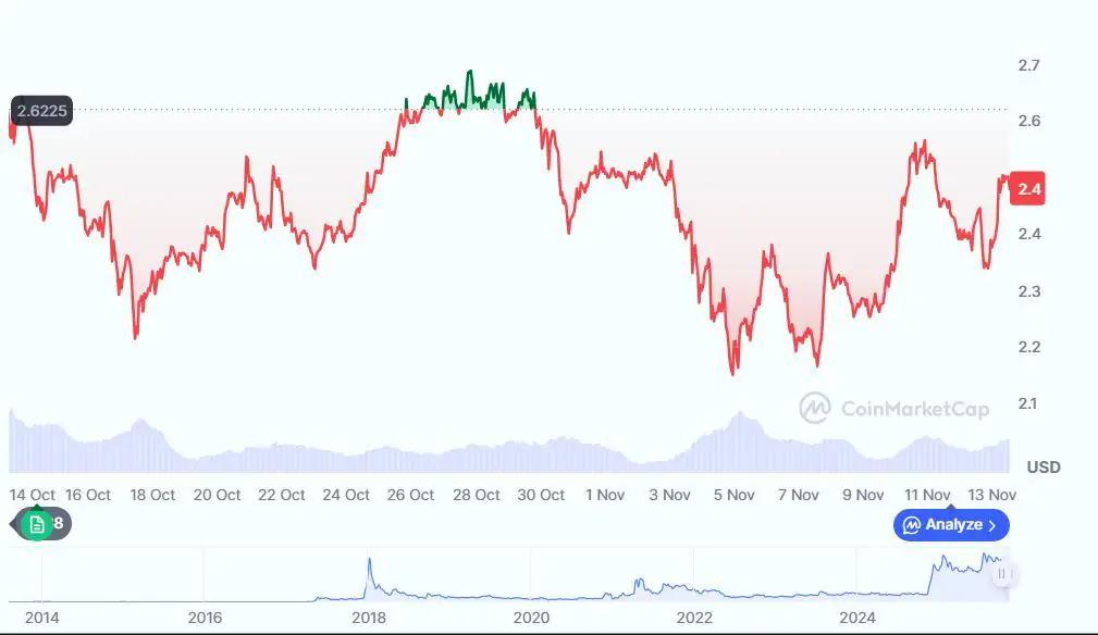11月13日,XRP的交易价格在2.50美元左右。市值