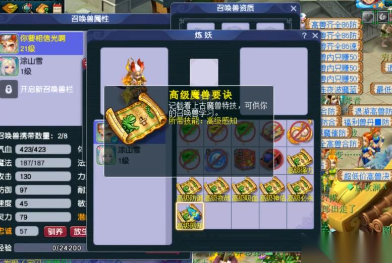 法术认证功能提供了一种稳定移除鬼魂术的途径。对于法宠,可先认证其法术技能(如雷击、烈火等),系统将随机添加一个辅助技能。随后取消认证时,需支付50万银币并选择收回一个技能,可指定鬼魂术。此方法仅适用于拥有可认证法术的宠物,且会降低物理伤害结果,因此仅推荐法宠或血宠使用。