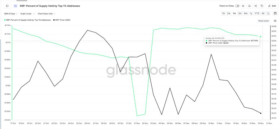 截至11月16日,这一数字约为87.714%。虽然降幅不大,但表明巨鲸们正在向市场投放部分XRP。