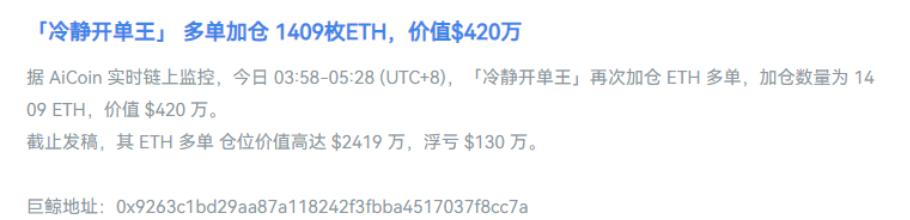 ●加仓了1409个ETH多单,价值约420万美元。预估清算价格2860-2891美元。