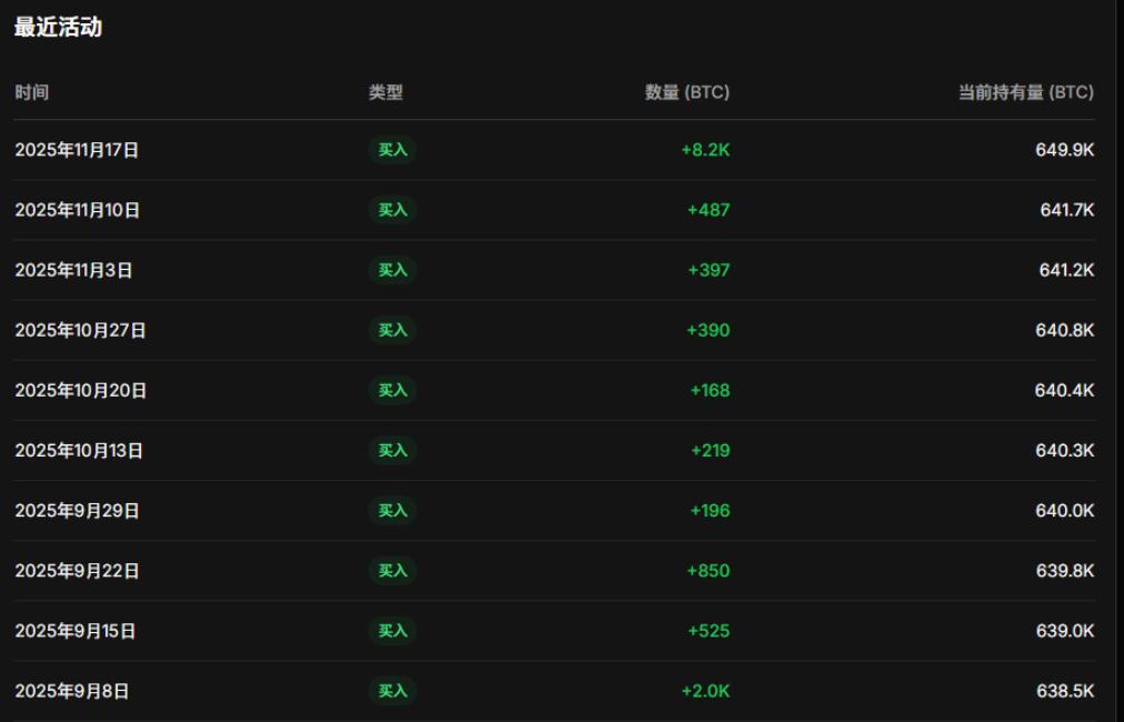 ●作为比特币最大持有者之一的MicroStrategy(已更名为Strategy)依旧坚持其比特币积累策略。11月10日至16日期间,该公司执行了8.356亿美元的BTC购买,以平均价格102,171美元购入8,178枚比特币。