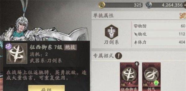 陈到的大招可以拼过很多的小招,一般都是从第二个回合开始他的强度就上来了,如果大家用陈到来过张辽的话,那么他的出招基本都会被整套的大招给拼掉,不管张辽是使用斗胸刀还是使用圈马刀,这里的陈到其实都是可以拼过他的一些小招式的,那么这里陈到其实后期用的话,大家可以利用全配被动来打很多的效果,所以在单挑挑战里面真的可以说是一个不亚于赵云的武将,他在天赋效果上面有一个征西御东的技能,这个技能是属于一个刀剑系的技能。