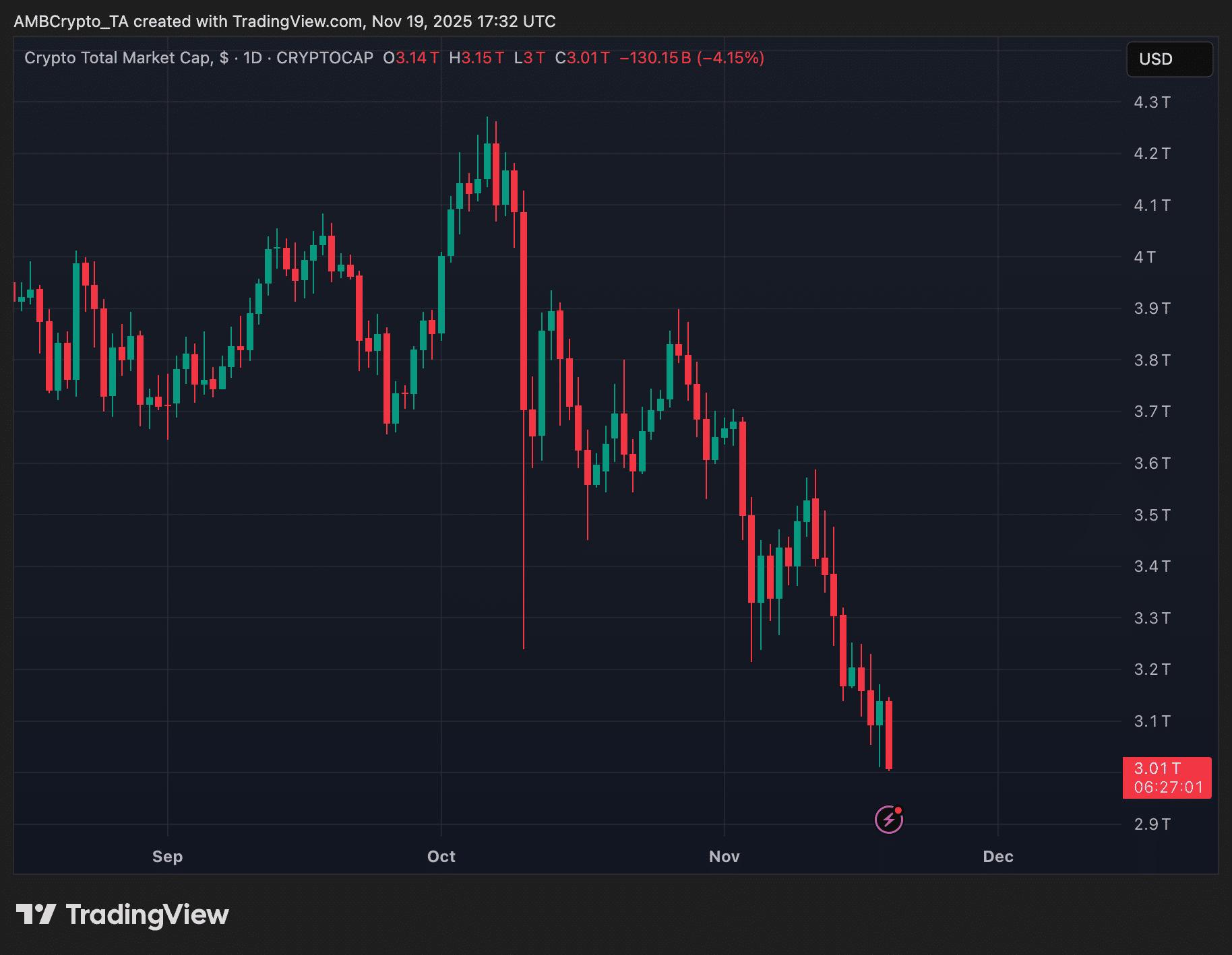 总计加密货币市值图表呈现出截然不同的景象。市场已跌破多个支撑位,并持续创出新低。