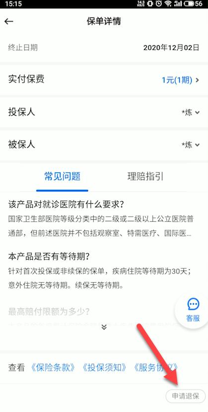 点击*下方的申请退保图标,填写退保理由后就可以退保了。