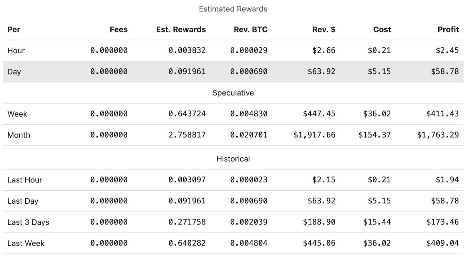 然后我们就可以得出一个惊人的数字:单台 Z15 Pro 每天的净收益接近 $60(UTC+8)!且从历史数据看,这么高的收益已经持续至少 1 周以上了。