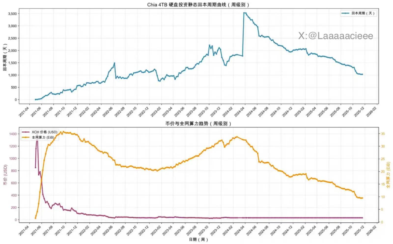 • 2021 年 5 月,Chia 曾引发全球硬盘断货。当时 XCH 币价飙升至 $1,600,早期的硬盘投入显示的静态回本周期一度被压缩至130 天以内(UTC+8)。这种极致的暴利瞬间引发了全球存储算力的海啸。然而,随之而来的是惨烈的「剪刀差」: 尽管币价下跌,但前期订购的硬盘持续上线,全网算力在币价见顶后依然惯性暴涨,回本周期从 30 天被迅速拉长至3,000 天以上。