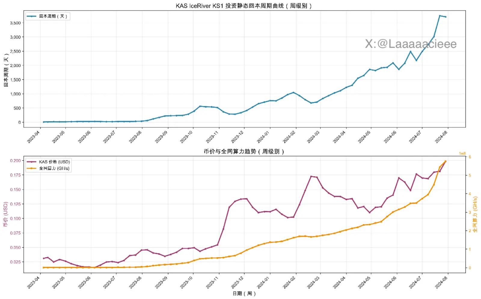 观察 IceRiver KS1 矿机的数据,在 2023 年中旬,其回本周期一度低至150 天(UTC+8)。与 Chia 不同的是,KAS 的币价甚至保持了上涨趋势。但即便如此,矿工依然亏损,因为算力增长的斜率远超币价上涨的斜率。工业级 ASIC 的快速迭代和大规模部署,让全网难度呈指数级上升。尽管币价坚挺,但由于难度暴涨,KS1 这款机器的回本周期依然不可逆转地飙升至3,500 天。