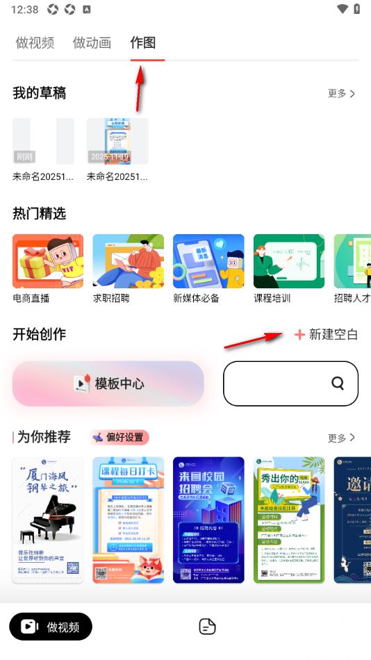 1.当我们进入到来画APP这款软件之后,直接将顶部位置的【作图】选项点击打开,再点击打开【新建空白】。